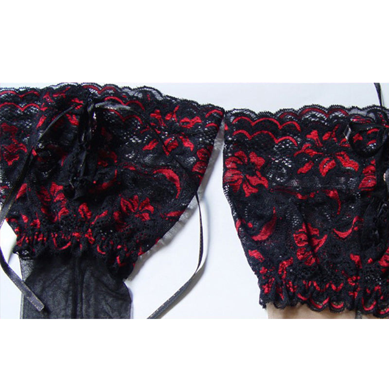 Introducing our elegant sheer thigh-high stockings, designed with a 16 cm (6 in) wide black-and-red floral lace top featuring a silicone anti-slip band for a secure, stay-up fit. Crafted from lightweight, breathable nylon, they offer a smooth, barely-there feel that complements any outfit. One size fits most, suitable for weights 40–60 kg / 88–130 lbs. Perfect for elevating your everyday look or festive occasions like Halloween and Christmas. To preserve the delicate lace and silicone grip, we recommend hand washing. Step out in confidence with these sophisticated, practical stockings.
